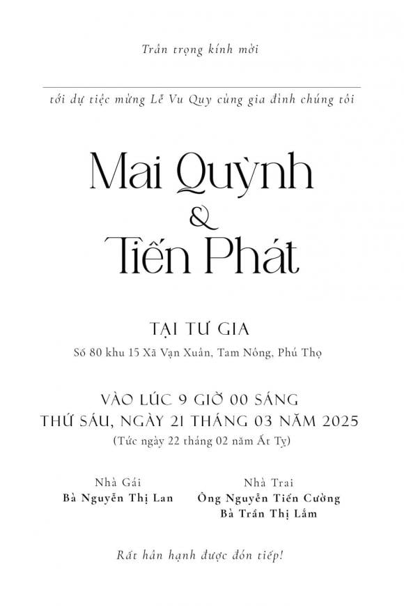 Mới đây, trên trang cá nhân, Quỳnh Lương tiết lộ sẽ chính thức lên xe hoa vào ngày 21/3. Theo nội dung thiệp mời, lễ cưới của Quỳnh Lương và Tiến Phát sẽ diễn ra vào lúc 9 giờ sáng ngày 21/3/2025 (tức ngày 22 tháng 2 Âm lịch). Địa điểm tổ chức là tại tư gia ở Phú Thọ. Tại đây, cô cũng hài hước bày tỏ: “Tưởng trong phim là mẹ bạn trai sẽ đưa cho 5 tỷ để bảo chia tay, ai ngờ cha mẹ anh lại đưa anh ra nhà tui hỏi cưới”. Ngay sau khi bài viết được chia sẻ đã thu hút sự quan tâm cực lớn từ phía cư dân mạng.