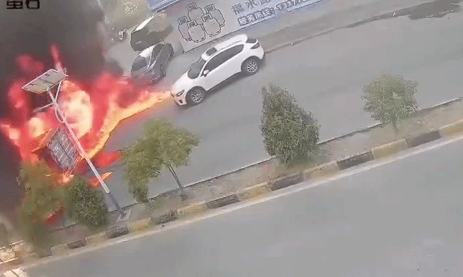 Chiếc xe tải dừng lại trong khung hình của camera giám sát trên một con phố ở Hồ Bắc, ngày 8/3. Lửa từ gầm sau đó nhanh chóng trùm cả chiếc xe kèm khói đen bốc mù mịt.