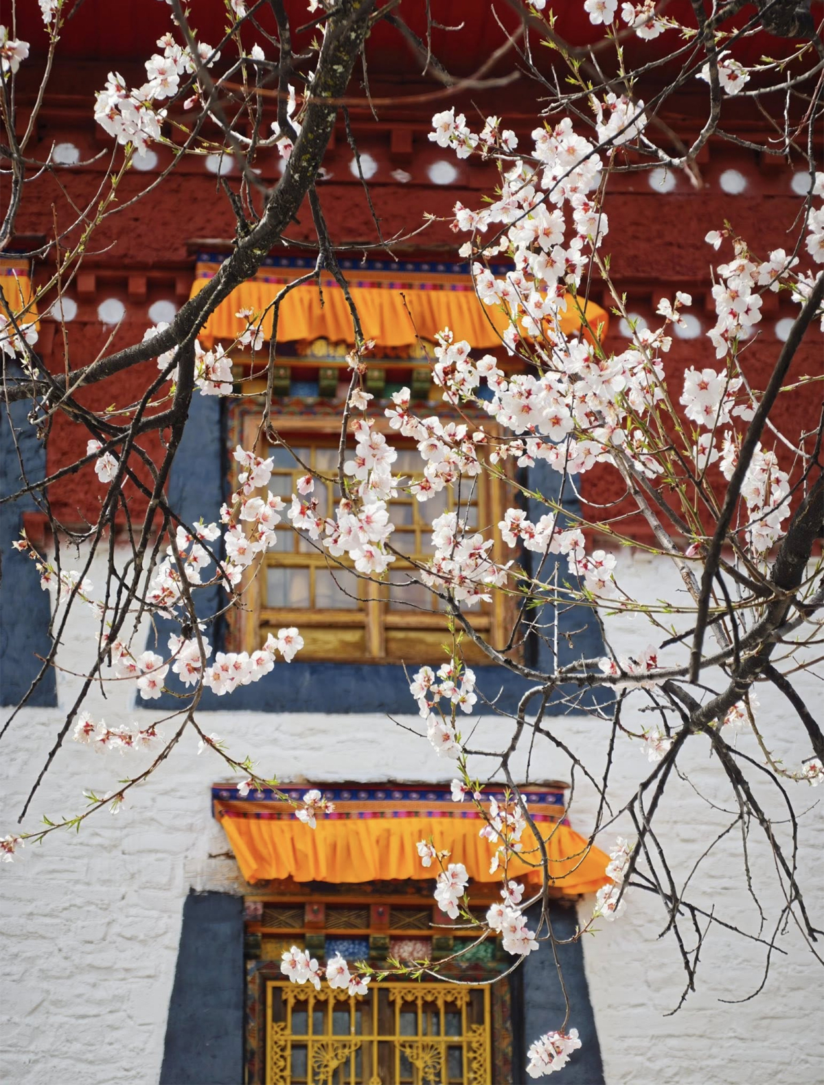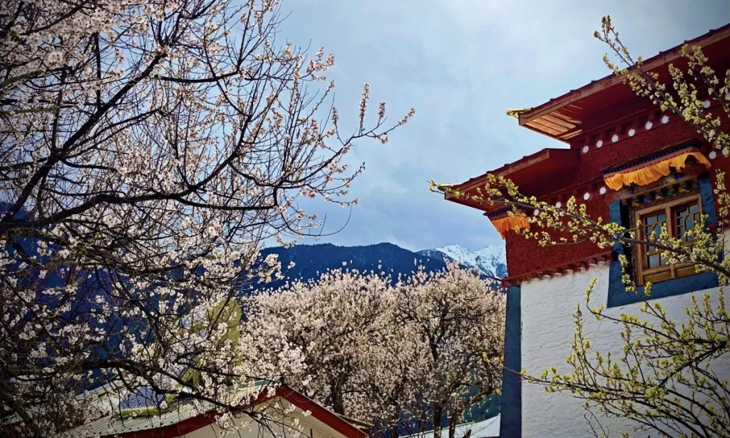 Tây Tạng đang là mùa xuân, nhiều loài hoa nở bung nở khắp nơi như anh đào, mơ, cải, trong đó, hoa anh đào nhiều và nổi bật nhất.