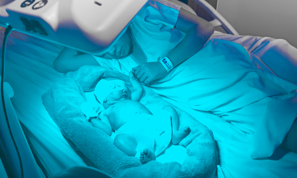 Chị Lành chăm sóc con gái phải chiếu đèn vì vàng da sau sinh. Ảnh: Bệnh viện Đa khoa Tâm Anh