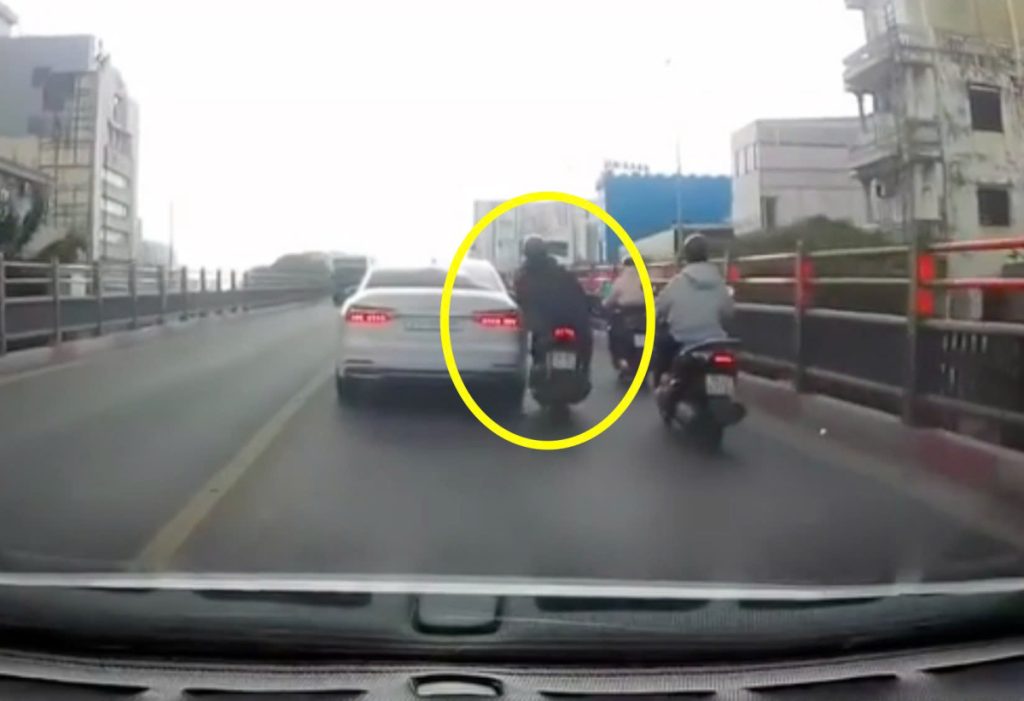 Tình huống giao thông: Đường hẹp, đông xe một người đi xe máy phóng nhanh, luồn qua khe rất hẹp giữa ôtô và xe máy để vượt lên, hôm 27/3 tại cầu vượt Hoàng Hoa Thám. Va chạm vào thân ôtô, người đi xe máy nhao lái, tiếp tục va chạm với xe máy bên cạnh rồi ngã trước đầu ôtô. Chưa rõ thương vong sau vụ va chạm.