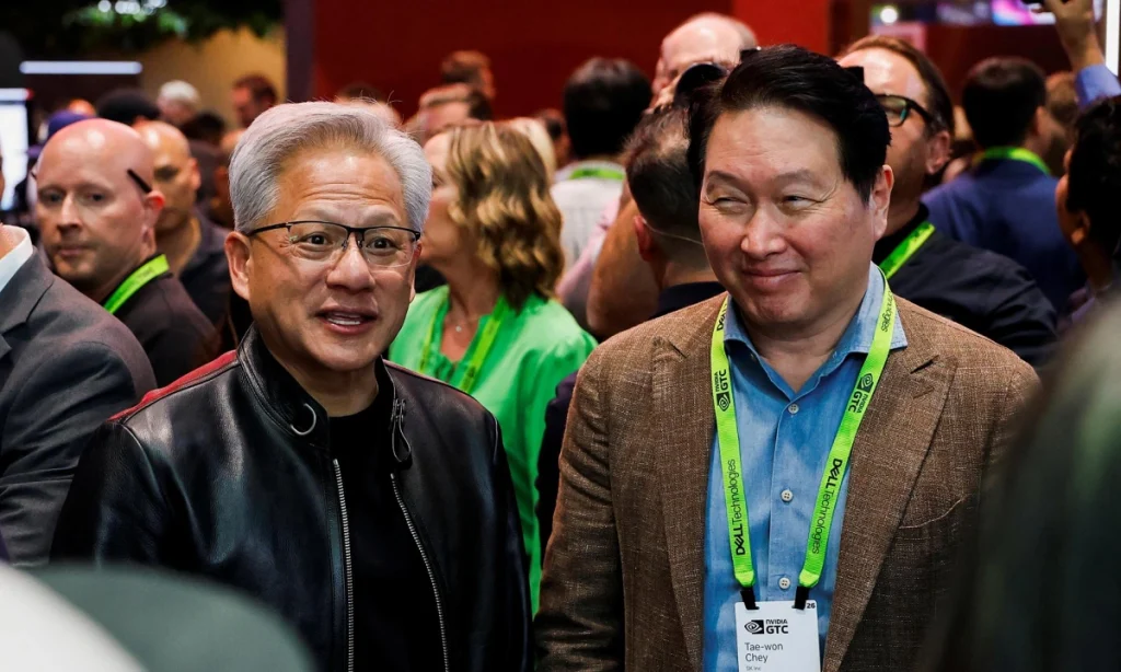 Chủ tịch SK Hynix Chey Tae-won (phải) và CEO Nvidia Jensen Huang tại Nvidia GTC 2026 ở San Jose, California. Ảnh: Yonhap