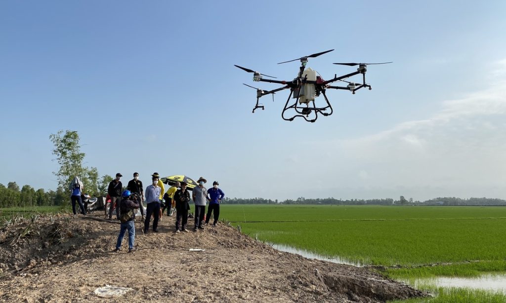 Drone phun thuốc trên cánh đồng huyện Tam Nông, tỉnh Đồng Tháp một trong những địa phương đầu tiên của tỉnh áp dụng mô hình mới này. Ảnh: Nghĩa Lâm