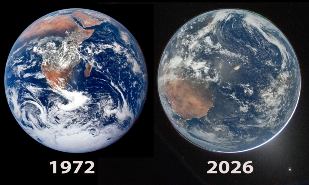 Ảnh chụp Trái Đất năm 1972 (trái) và 2026. Ảnh: NASA