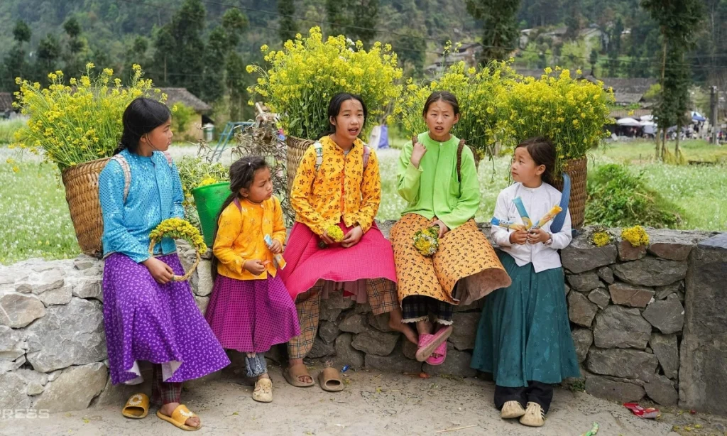Tại con dốc Thẩm Mã nổi tiếng của xã Phố Bảng, hình ảnh những đứa trẻ 8-10 tuổi đeo gùi hoa cải vàng rực, nặng hơn 10 kg, xếp thành hàng ngang bên bậc đá chờ khách du lịch, đã trở nên quen thuộc.