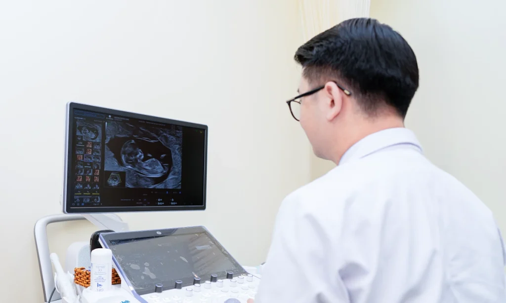 Bác sĩ Long siêu âm đo độ mờ da gáy cho một thai phụ. Ảnh minh họa: Phòng khám Đa khoa Tâm Anh Quận 7